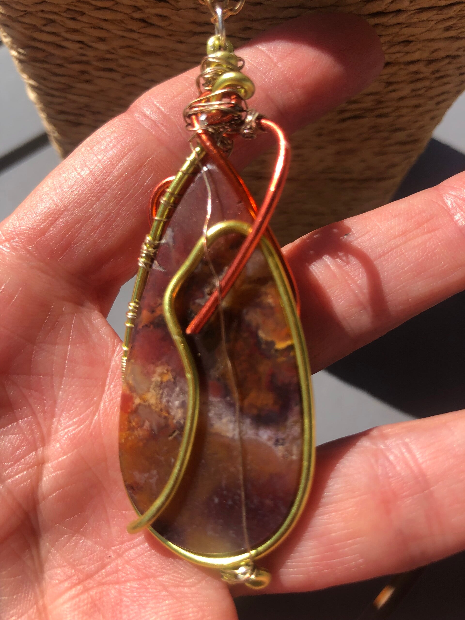 Cabochon pointe d'agate mousse rouge origine INDONESIE 5 cm H serti en wire wrap, entourage de la pierre pour le maintienfil aluminium souple orange et jaune, fil de fer.